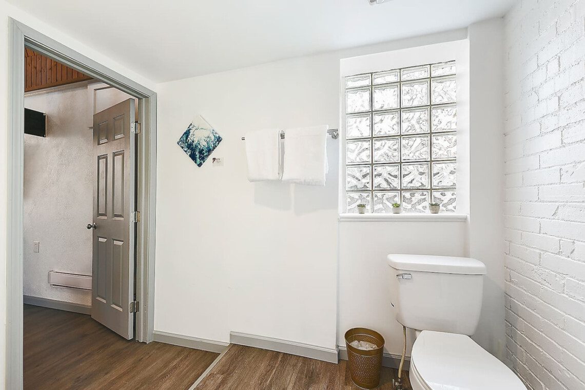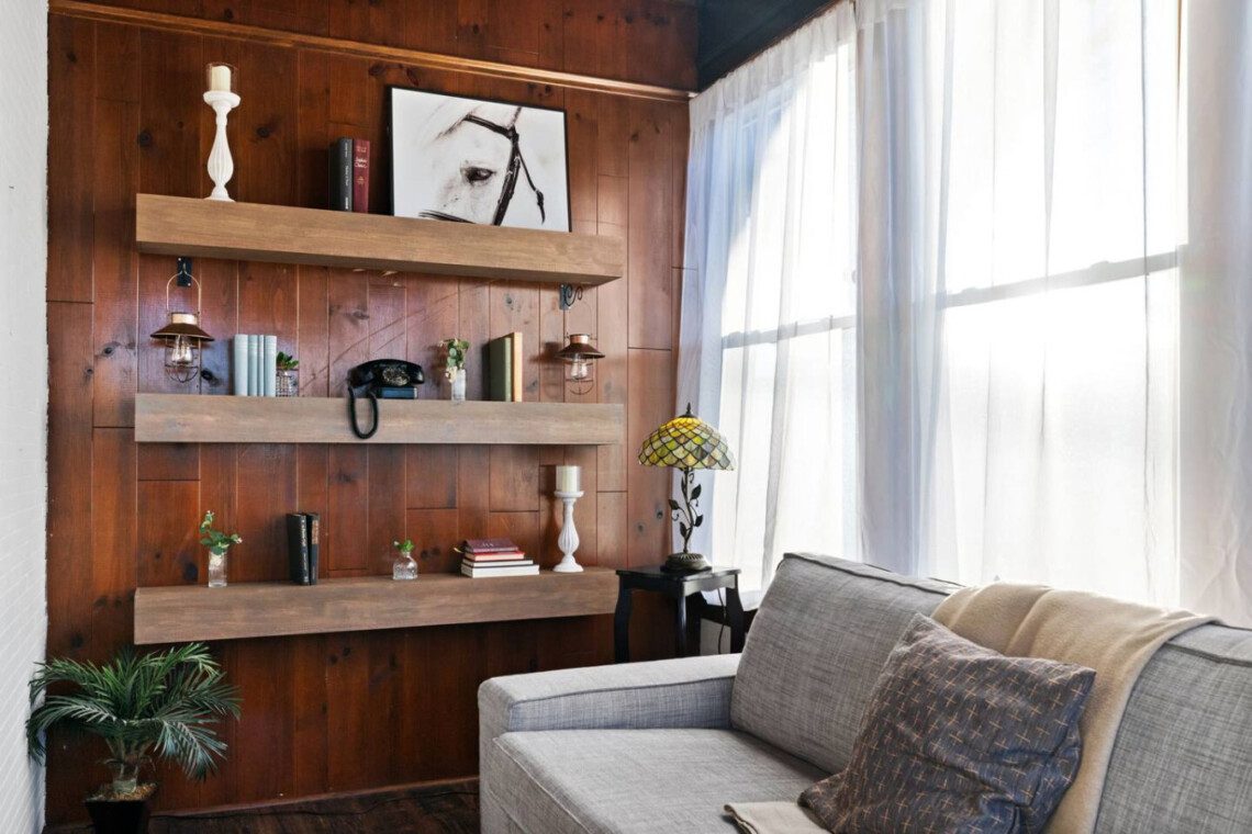 * Living room: Relax in the comfort of an old-world parlor, only this one has a wall-mounted 55″ smart TV. This main living room expands into a 3-season room for more space.