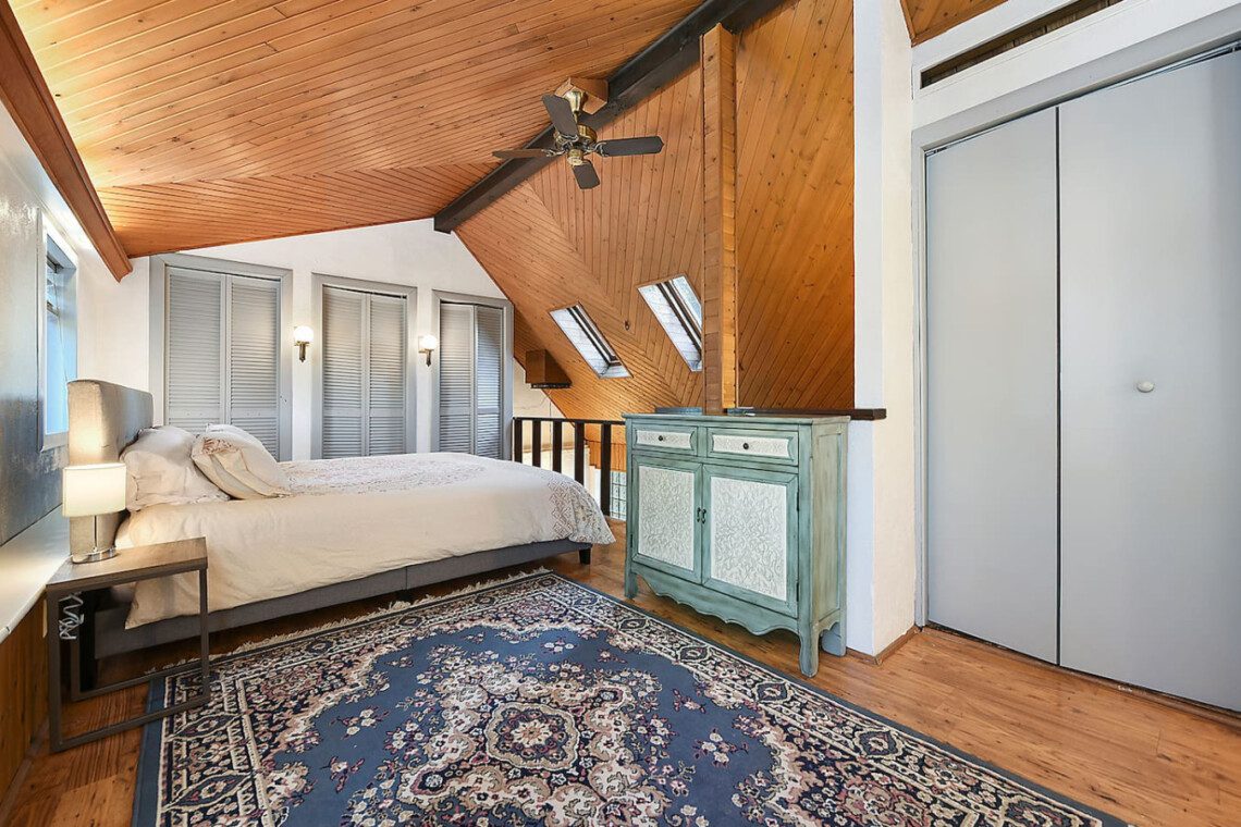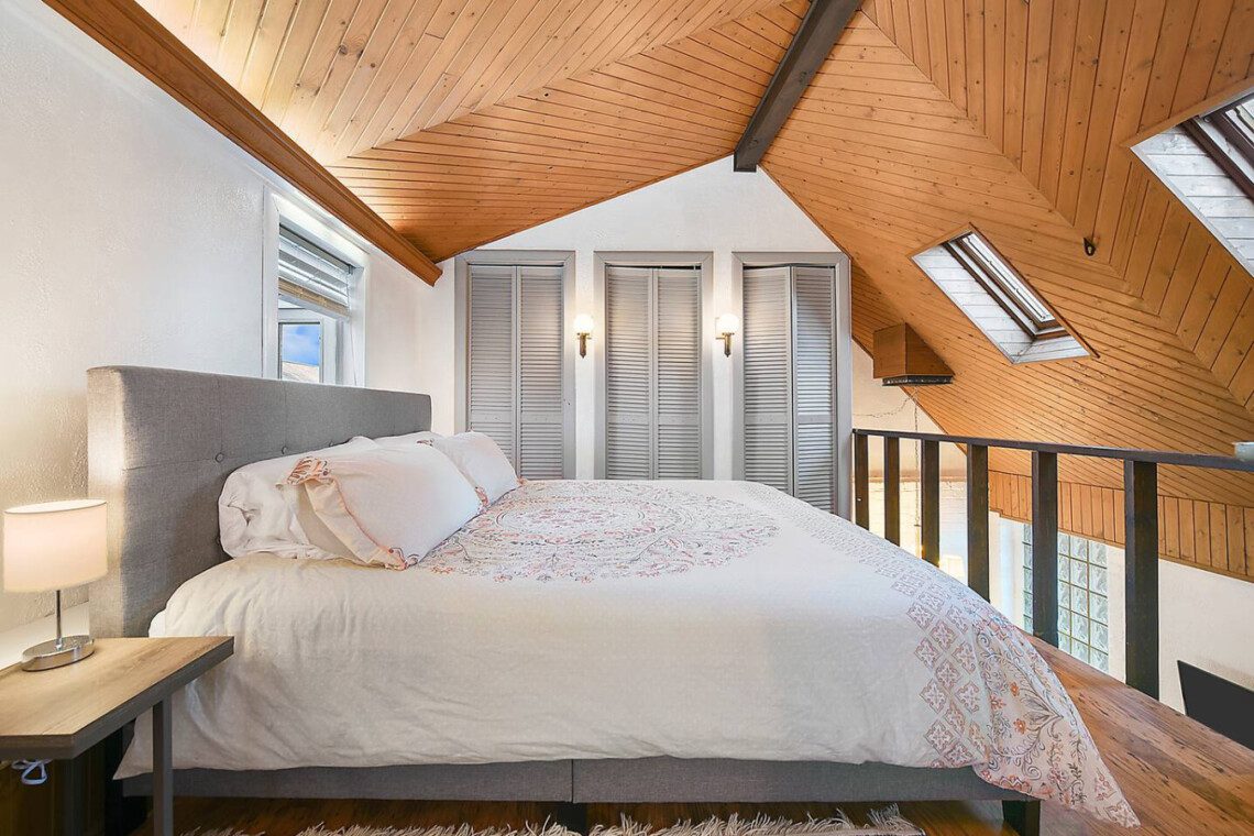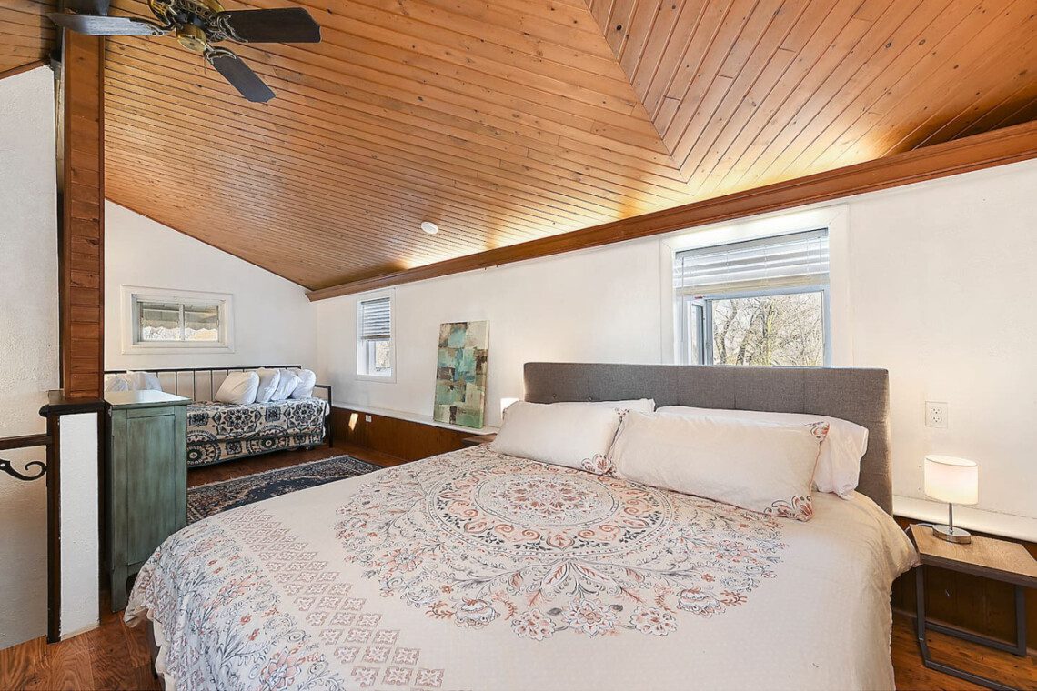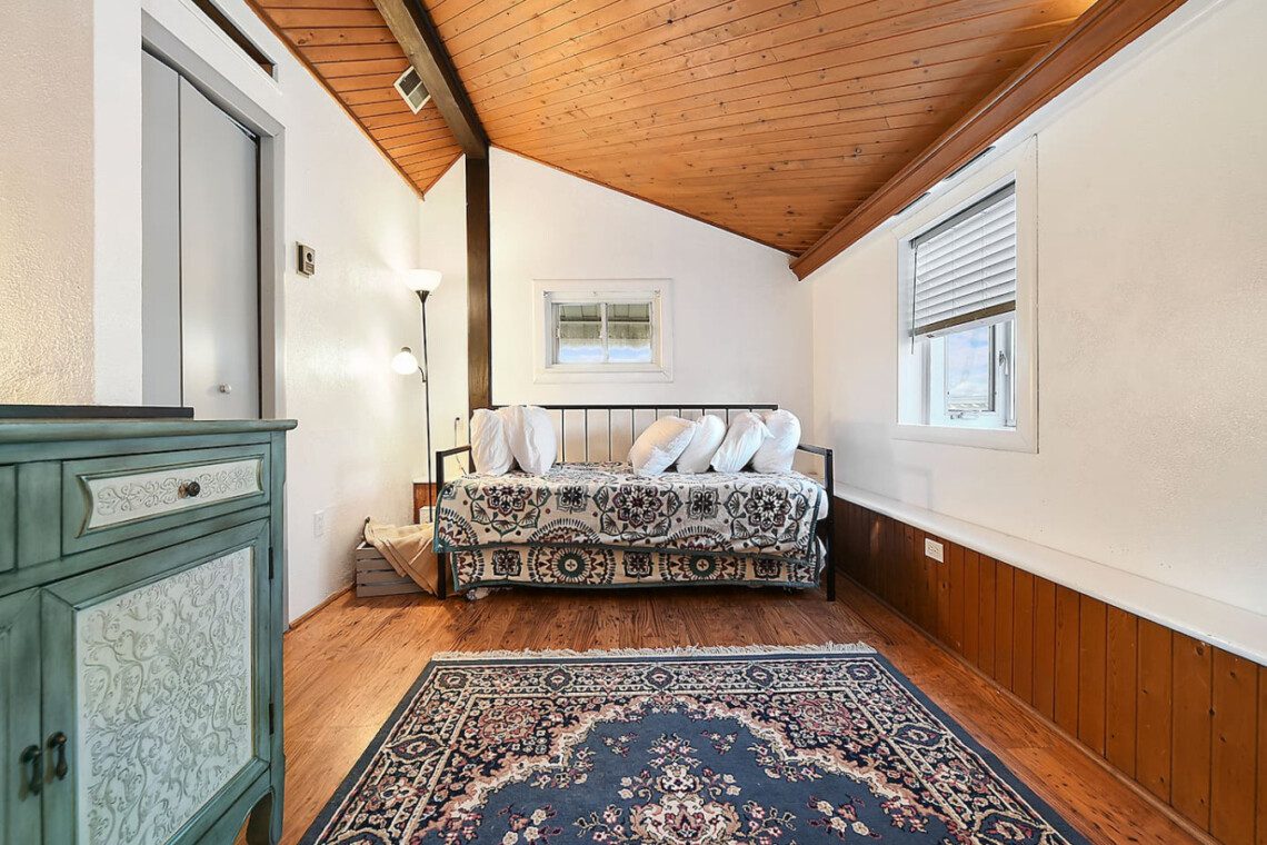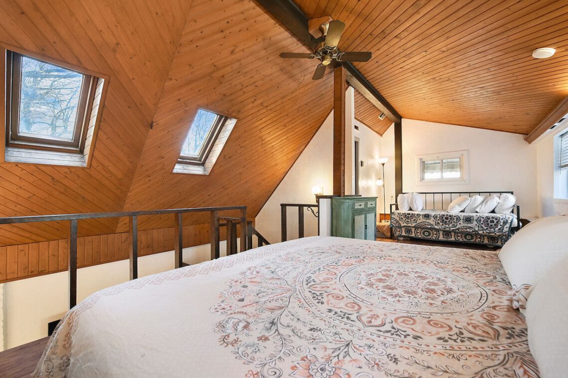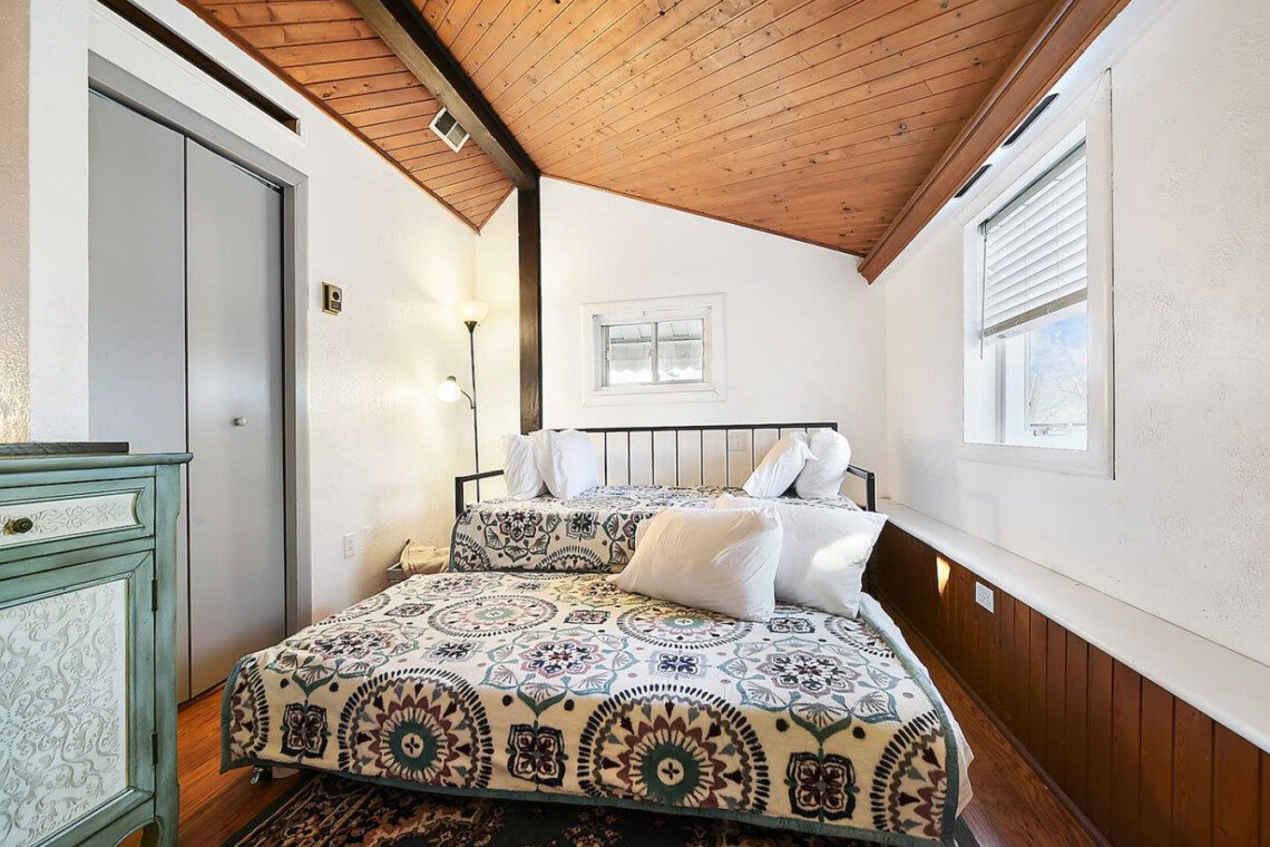 The second building on this property features a full bathroom, living room, kitchenette, and loft bedroom with a king bed, and a twin-over-twin trundle bed. There is also a deck with an extra BBQ grill and seating, overlooking the backyard.
