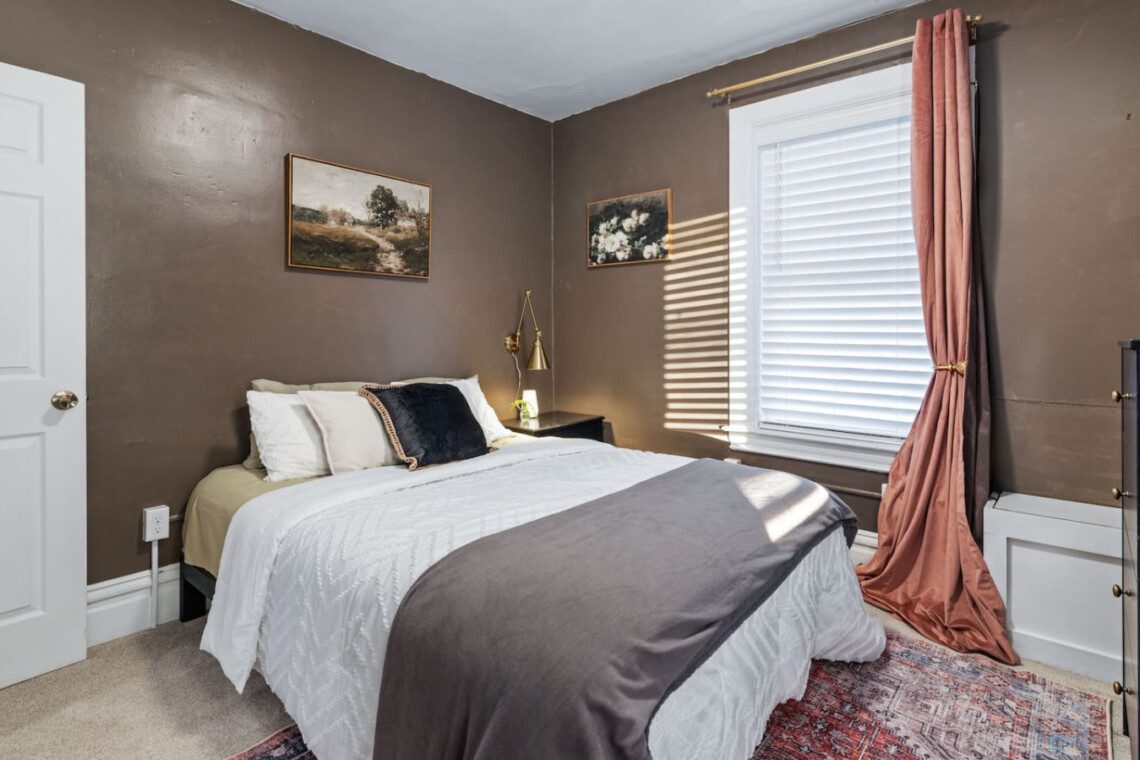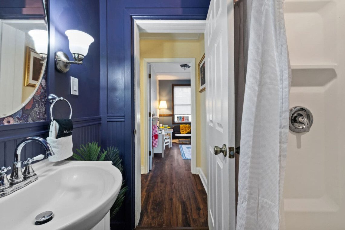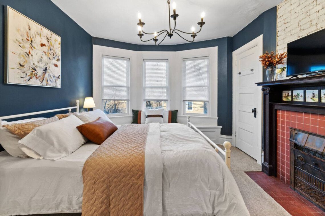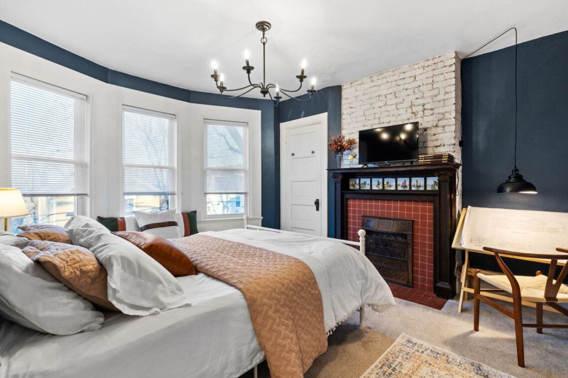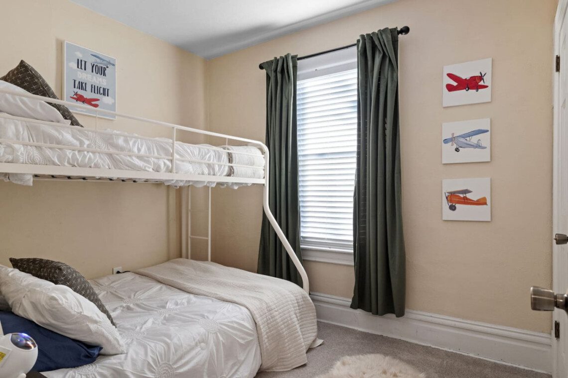 * Our second floor includes 3 comfortable bedrooms, each with queen beds and Smart TVs. There’s also a 4th (children’s) bedroom with a twin over full bunk bed that sleeps up to 3. Be sure to take note of charming details like the hand-painted fireplace tiles and views of the friendly neighborhood. The second floor also has a centrally located updated full bathroom.