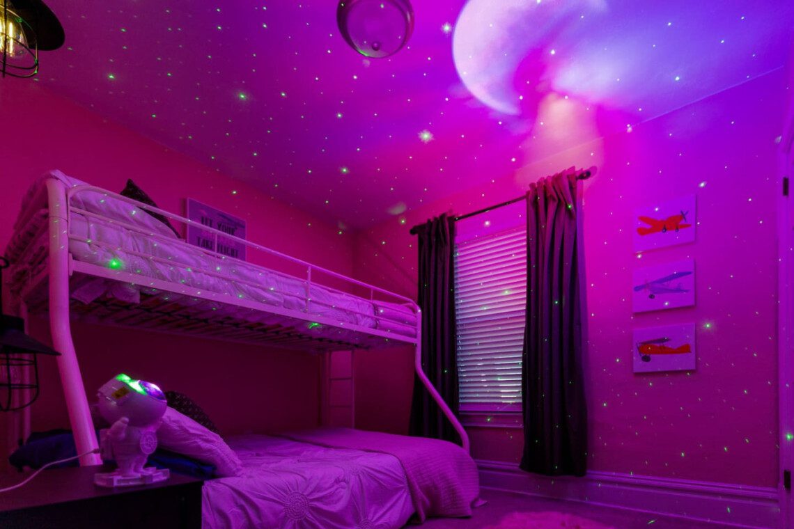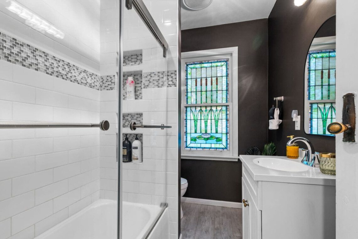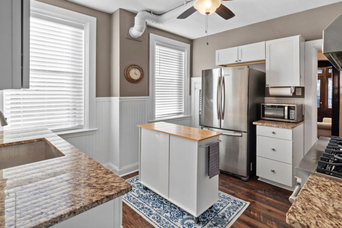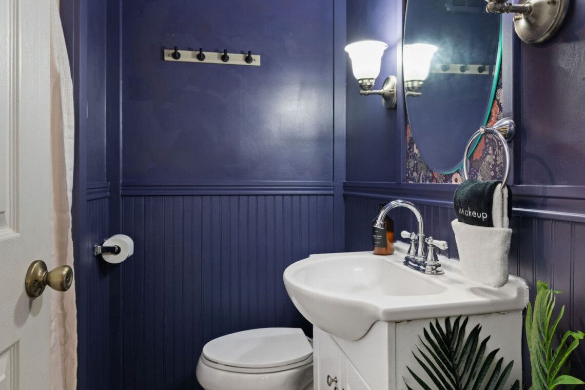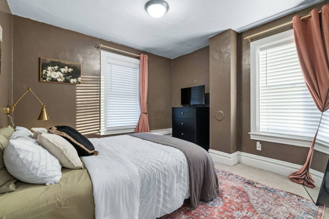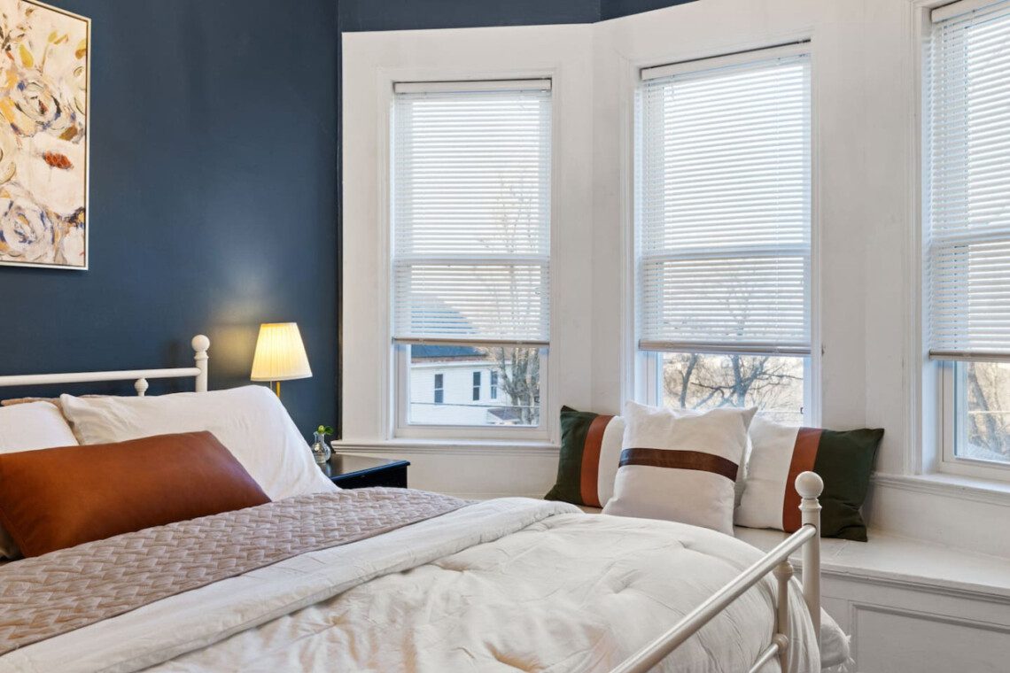 * Our second floor includes 3 comfortable bedrooms, each with queen beds and Smart TVs. There’s also a 4th (children’s) bedroom with a twin over full bunk bed that sleeps up to 3. Be sure to take note of charming details like the hand-painted fireplace tiles and views of the friendly neighborhood. The second floor also has a centrally located updated full bathroom.