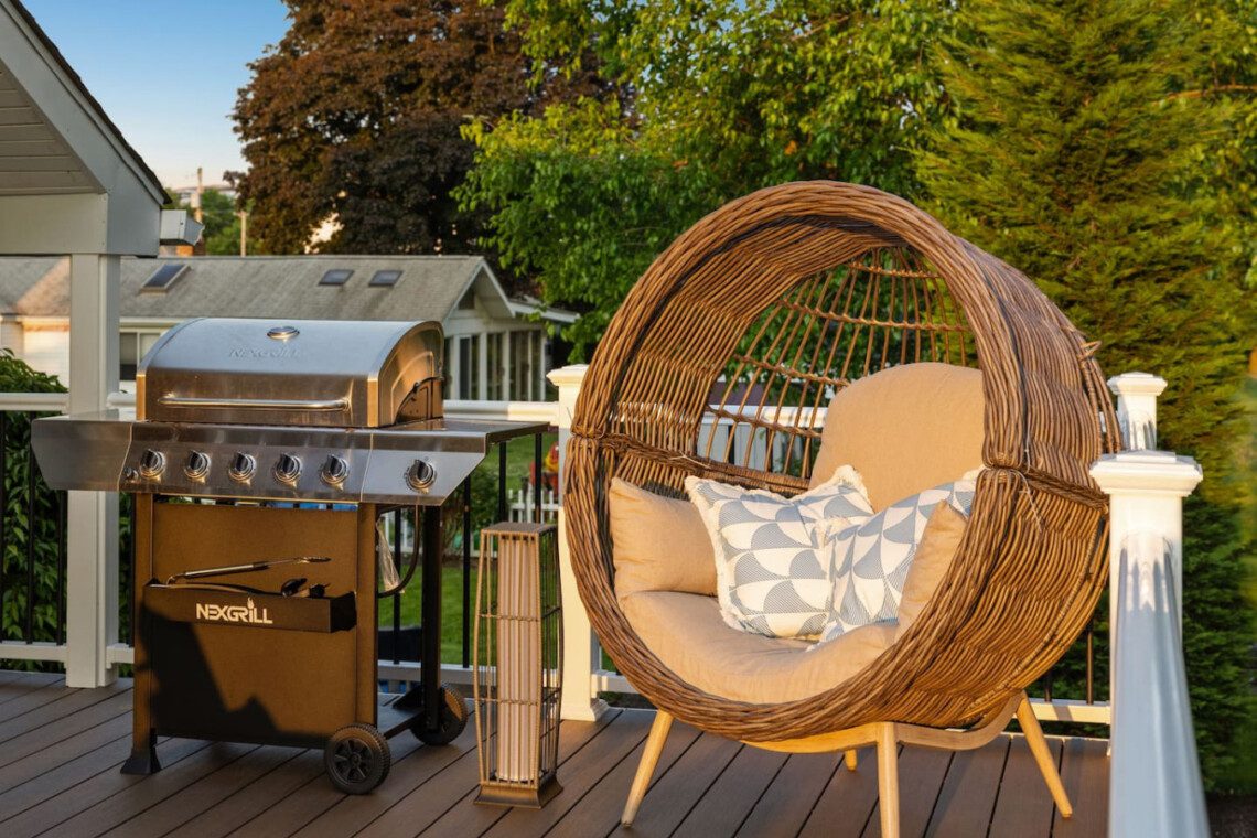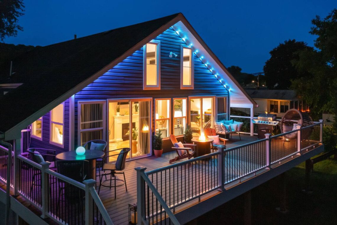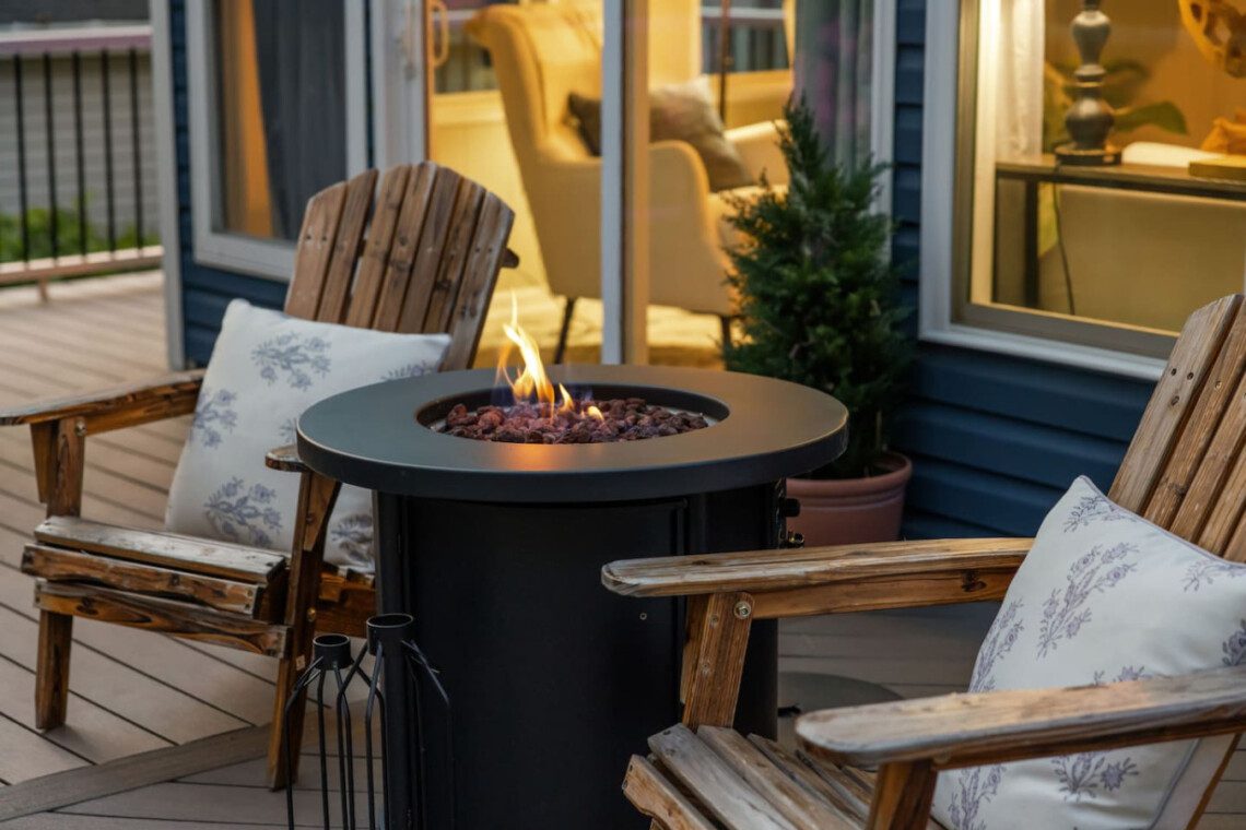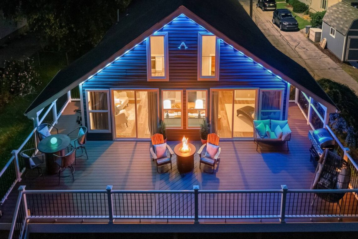 Outside: there are two sliding doors in the living room that open to a very spacious (runs the width of the house) deck. This deck includes two gas fire pits, an outdoor dining table (for 4), two love seats, and two Adirondack chairs. There are stairs down to the backyard.
