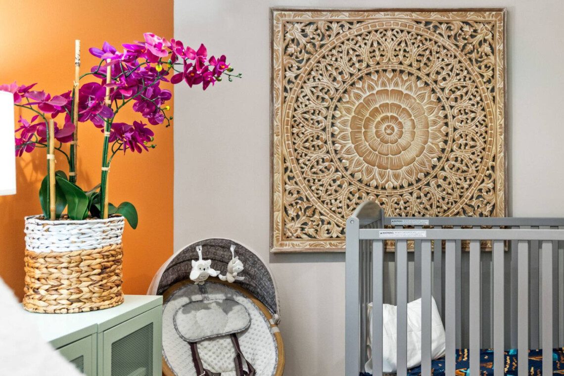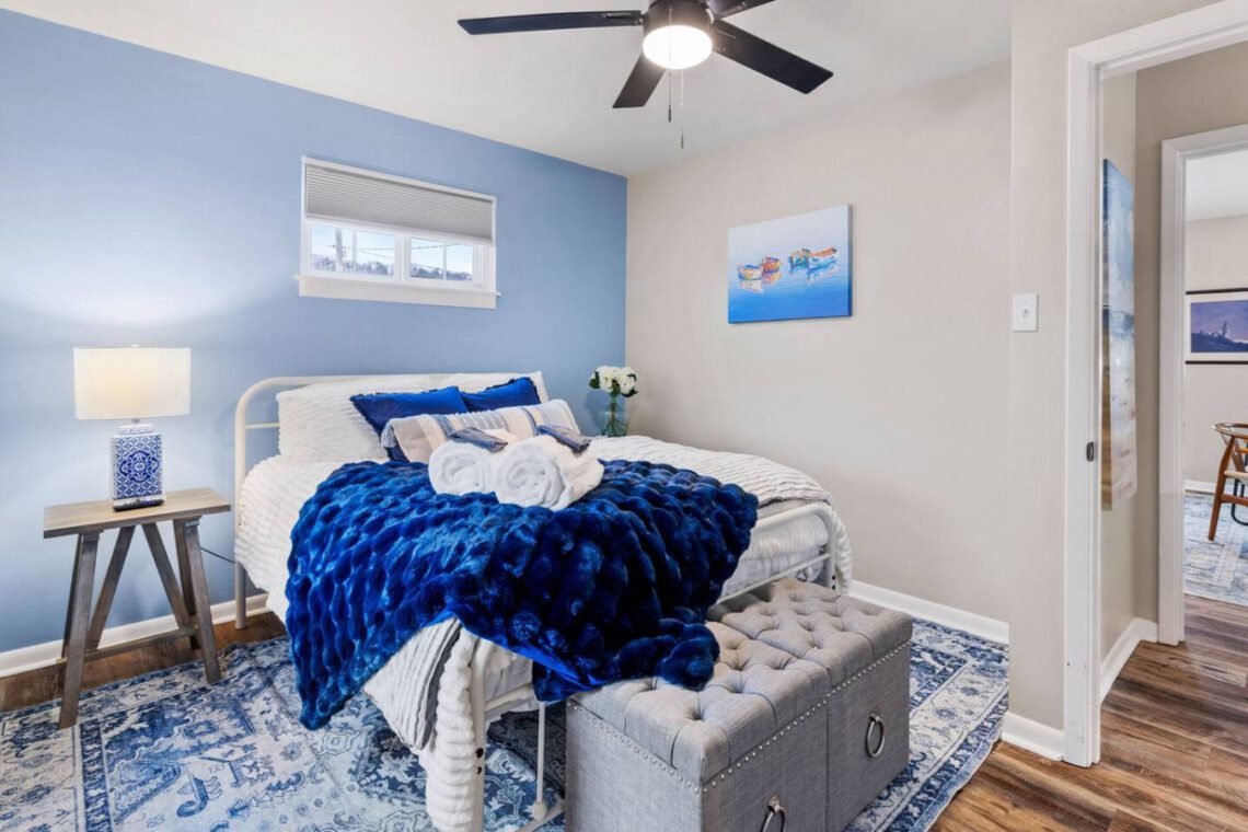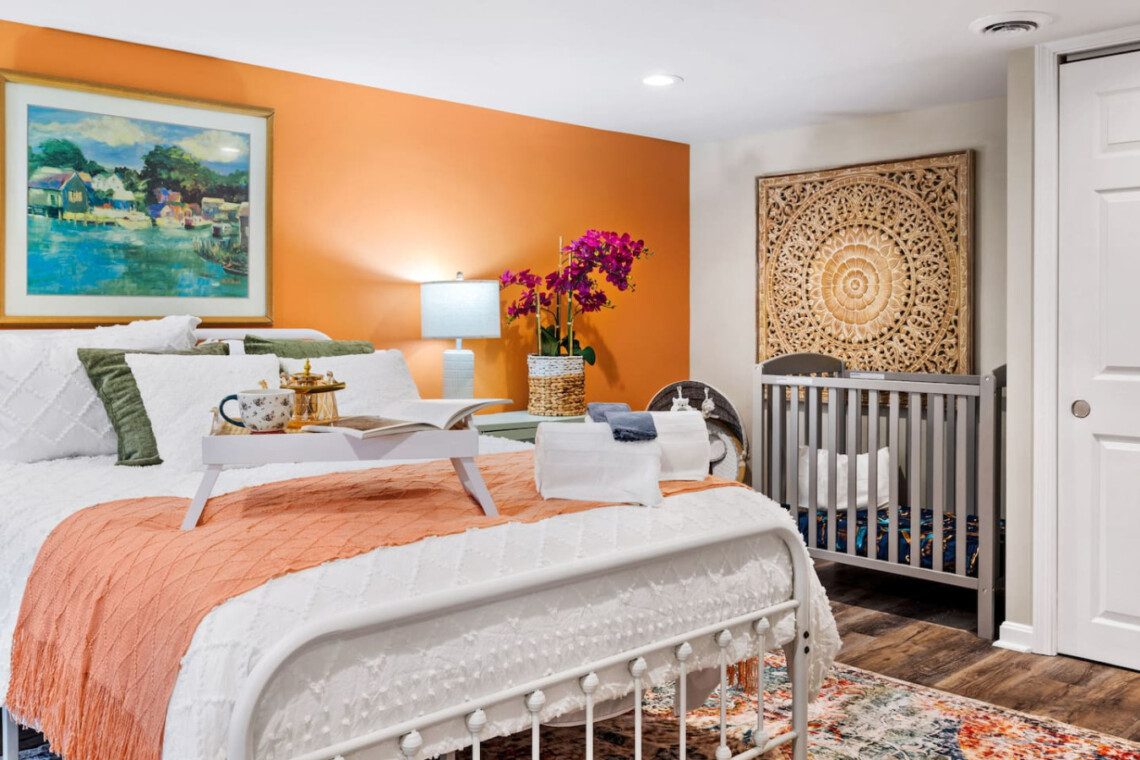 Across the hall is a similarly sized bedroom with a queen bed and a crib.