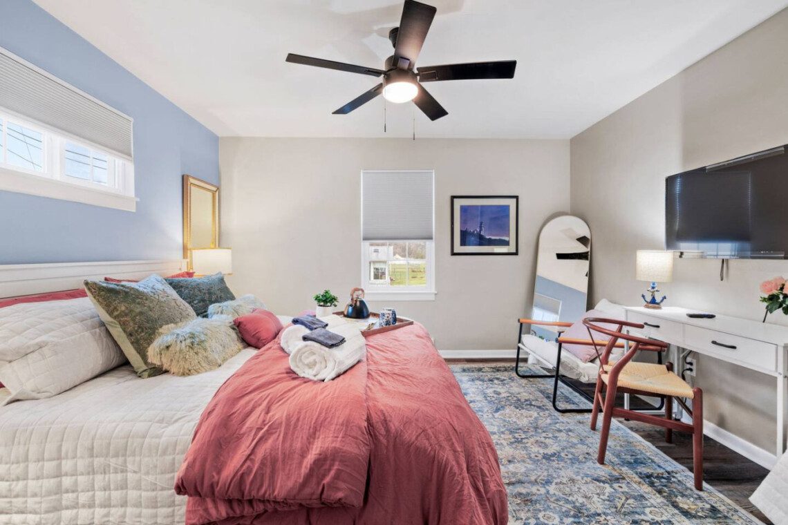 There are 2 additional bedrooms on this floor, and another full bathroom with a tub. One bedroom has a queen bed, and the other has a king bed and a dedicated workspace.