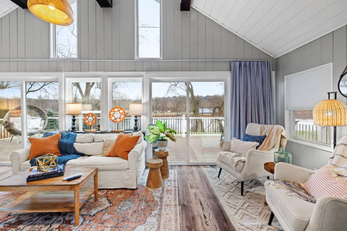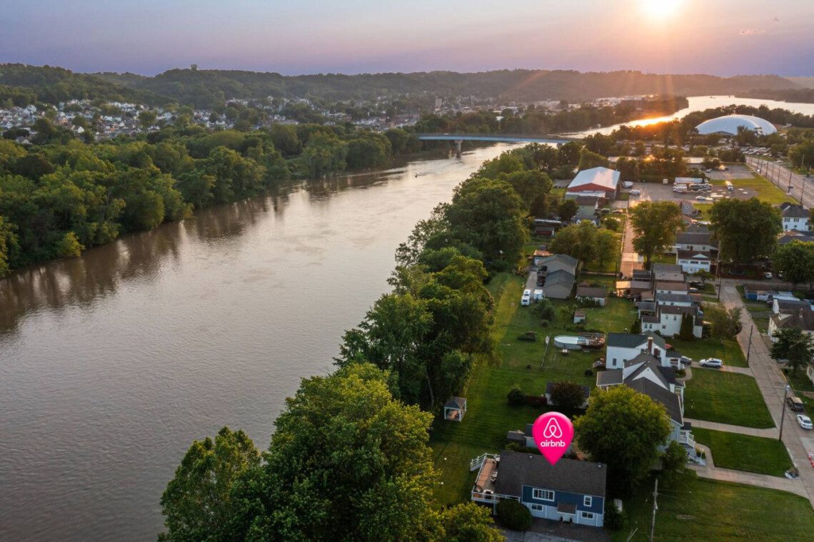 The second floor is the house’s primary gathering space – a fully-equipped kitchen (featuring an expansive coffee station), dining room (seating for 8-10 + 1 high chair), and a bright and airy living room with a whole wall of windows overlooking the Ohio River and the backyard. The living room also includes an electric fireplace.