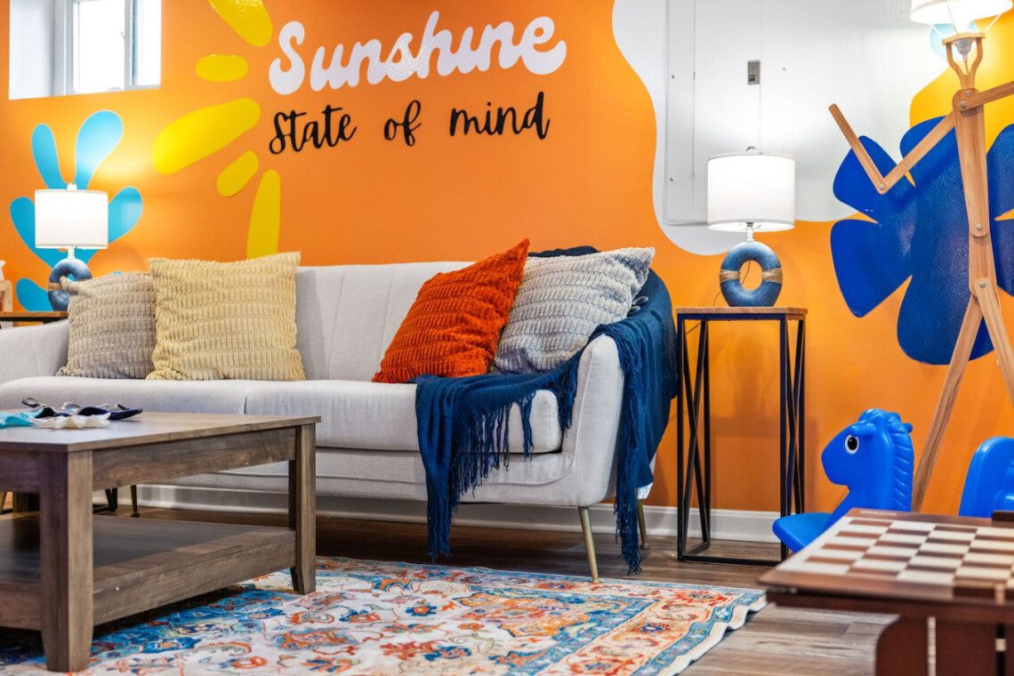 Upon entering the house, when you look to the right, you’ll find one bedroom has been set up for youngsters. There is a TV lounge area, and a table for board games, activities, or eating. This room also has a bunk bed with two full-size mattresses (in case you need extra space for 1 or 2 adult couples).