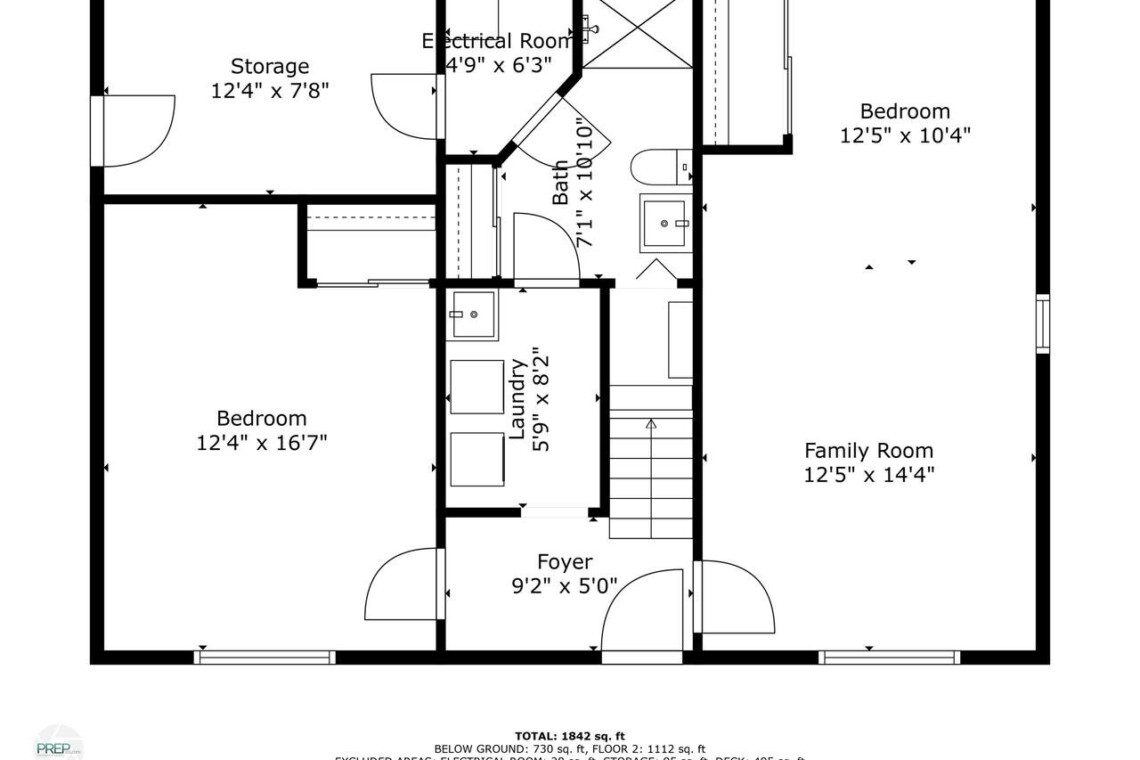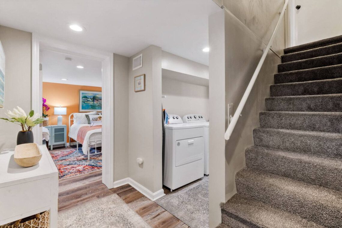 This home has two floors. The ground level includes two large bedrooms on opposing sides of the house, with a full bathroom in between. The washer and dryer are in the hallway to the bathroom.