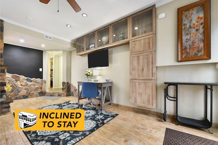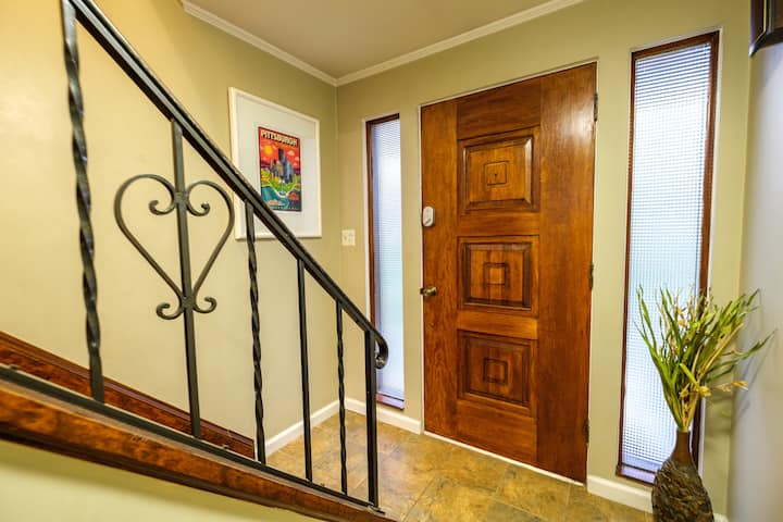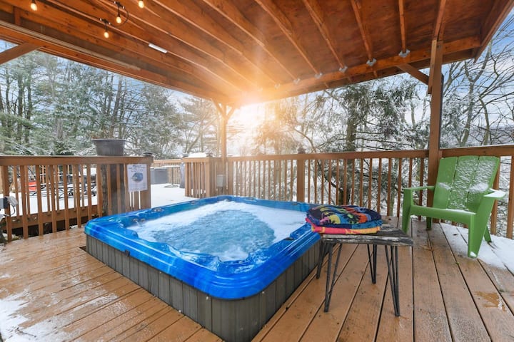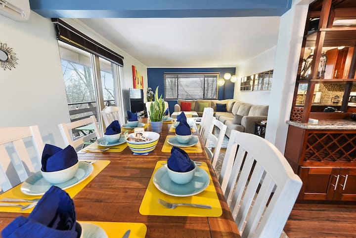 Just minutes from downtown, come & enjoy the incredible outdoor space featuring outdoor dining for 10, a 55″ smart TV, a brick oven, and a hot tub! Surrounded by trees and connected to hiking trails, you have your own oasis close to the city. Bring the whole family!